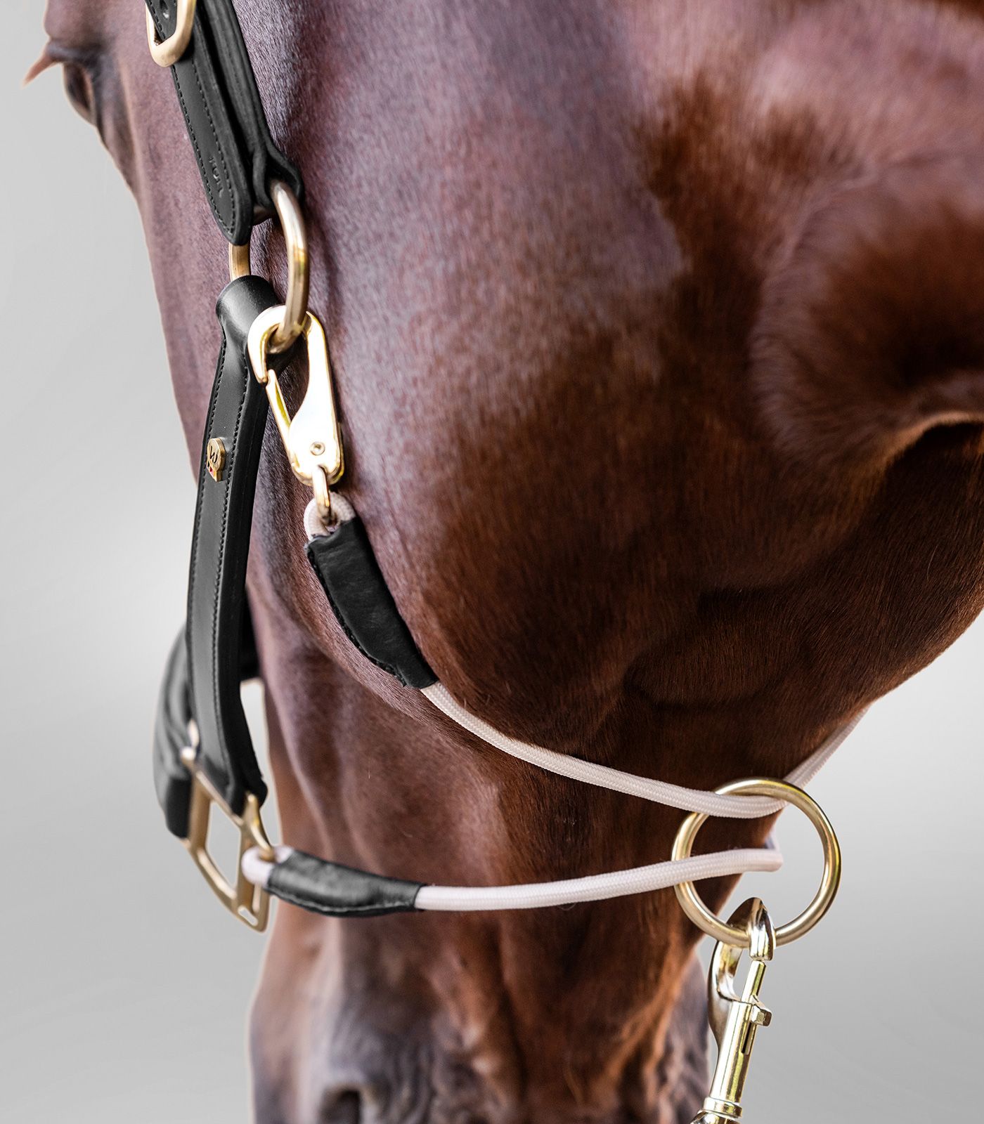 The throatlatch and noseband parts, made of fine rope, are connected with a rotating ring. This ensures a steady and secure fit of the halter and minimizes the risk of the horse "stepping into the rope."