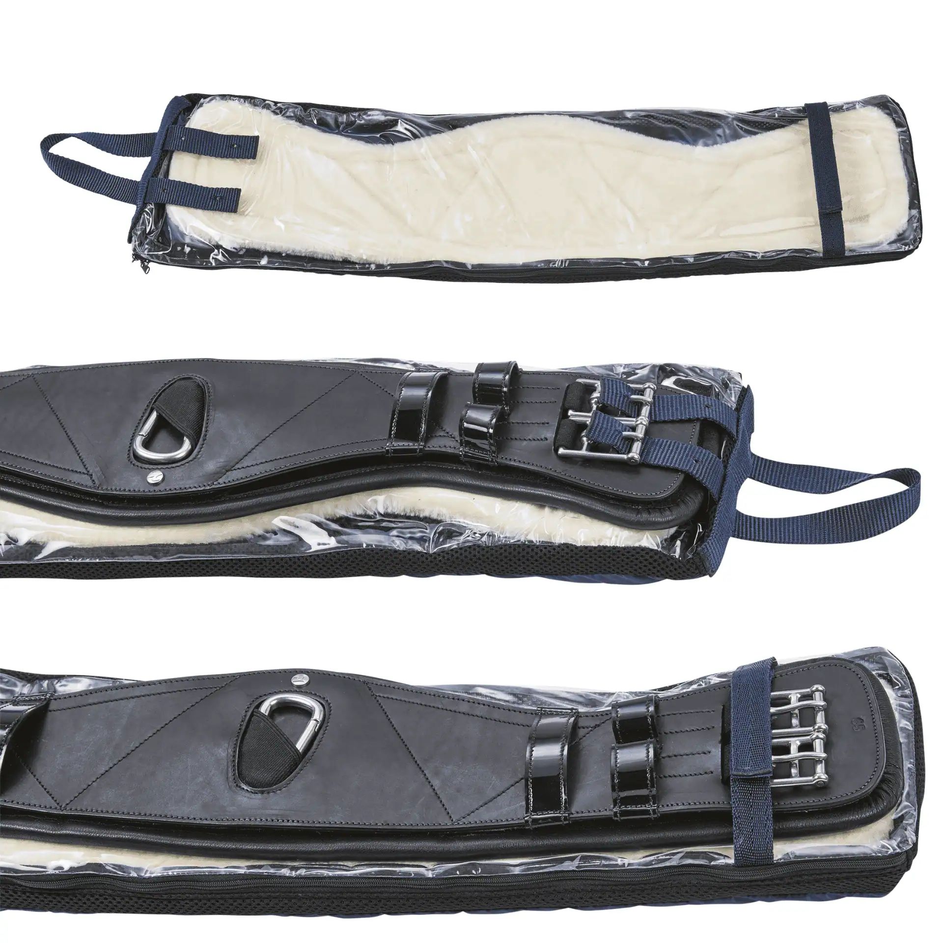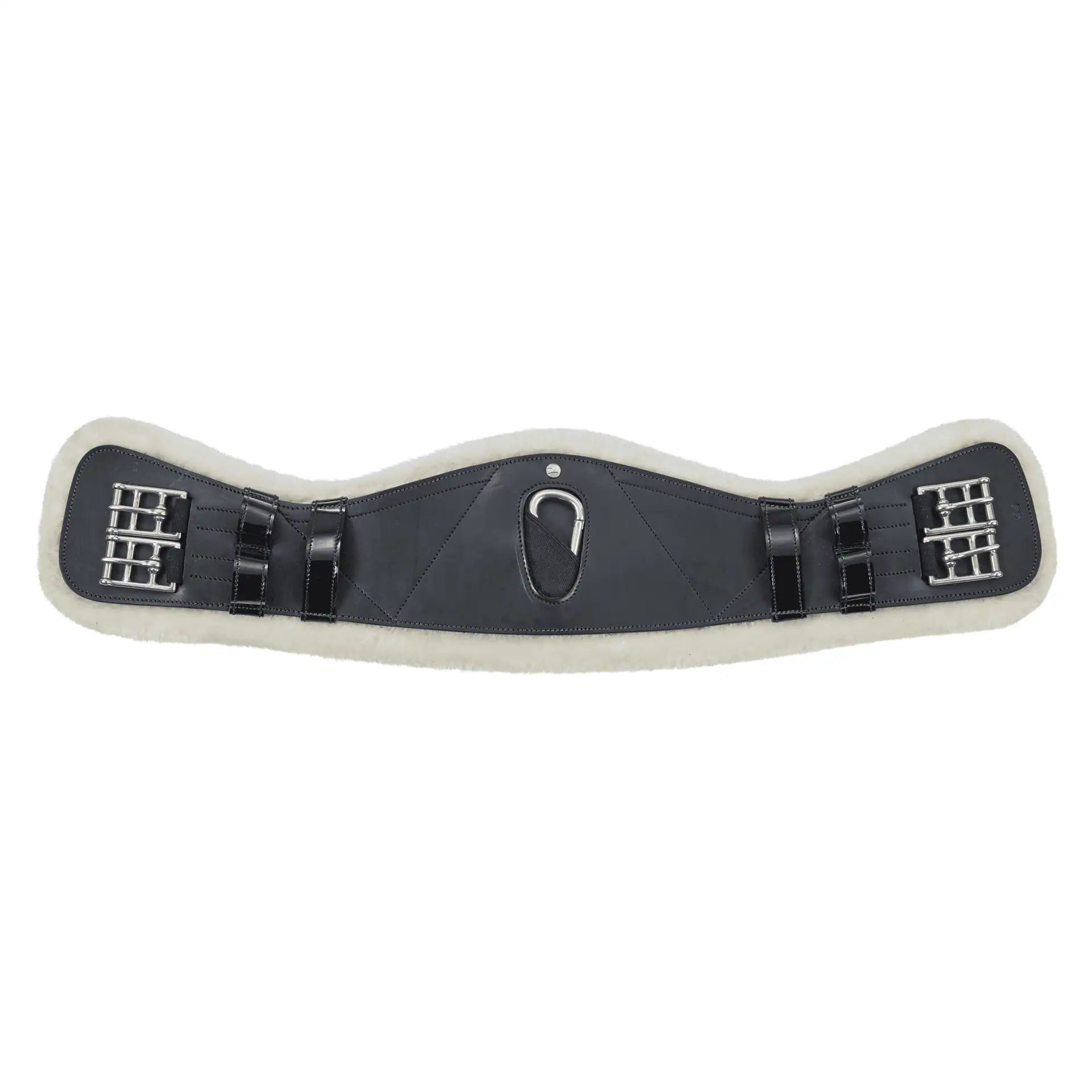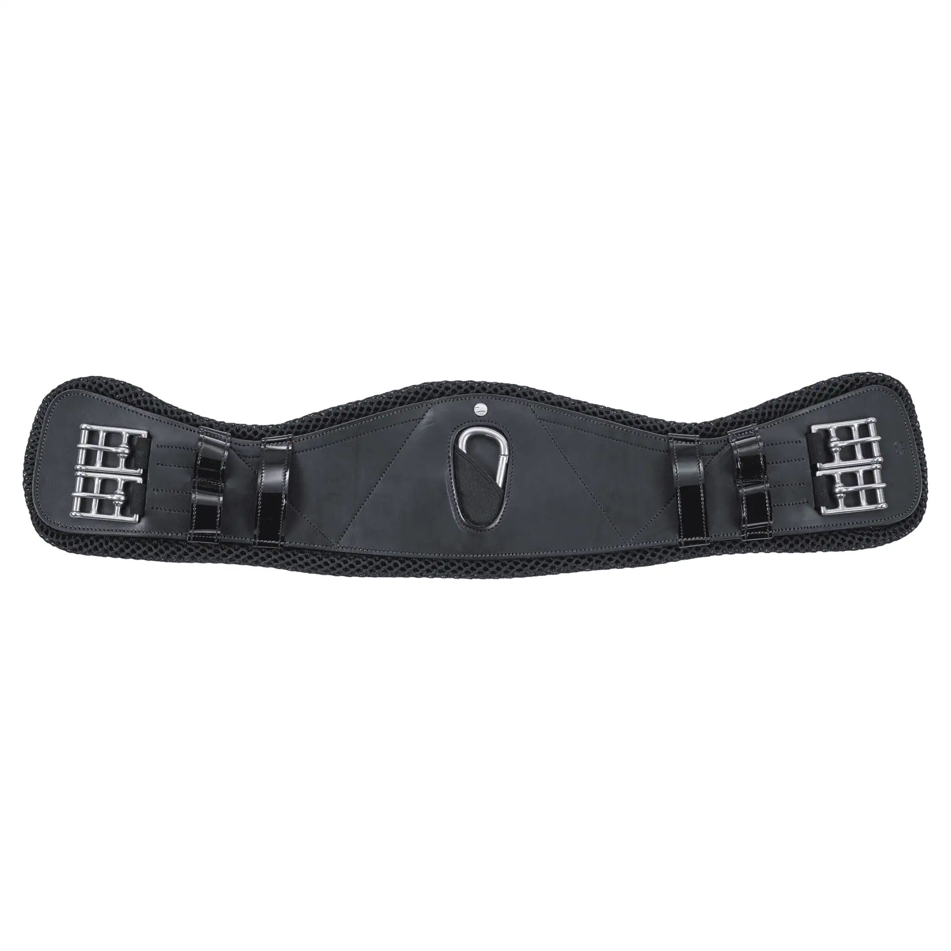 The girth is made from high-quality, predominantly vegetable-tanned American leather, which is not only durable and resource-friendly but also impresses with its soft feel. The expert buckles made of stainless steel ensure gentle, flat girthing, while the center carabiner makes attaching auxiliary reins super convenient. Subtle patent leather details add an elegant touch, the wide contact area (approx. 10–16.5 cm) provides optimal pressure distribution, and the tapered elbow area prevents chafing. Especially practical: a well-ventilated storage bag is included to keep the girth and paddings organized. All fittings are made from stainless steel, the 3D AIR® EFFECT padding consists of synthetic mesh, and the faux fur padding is designed for sensitive horse skin – all easy to clean and durable.