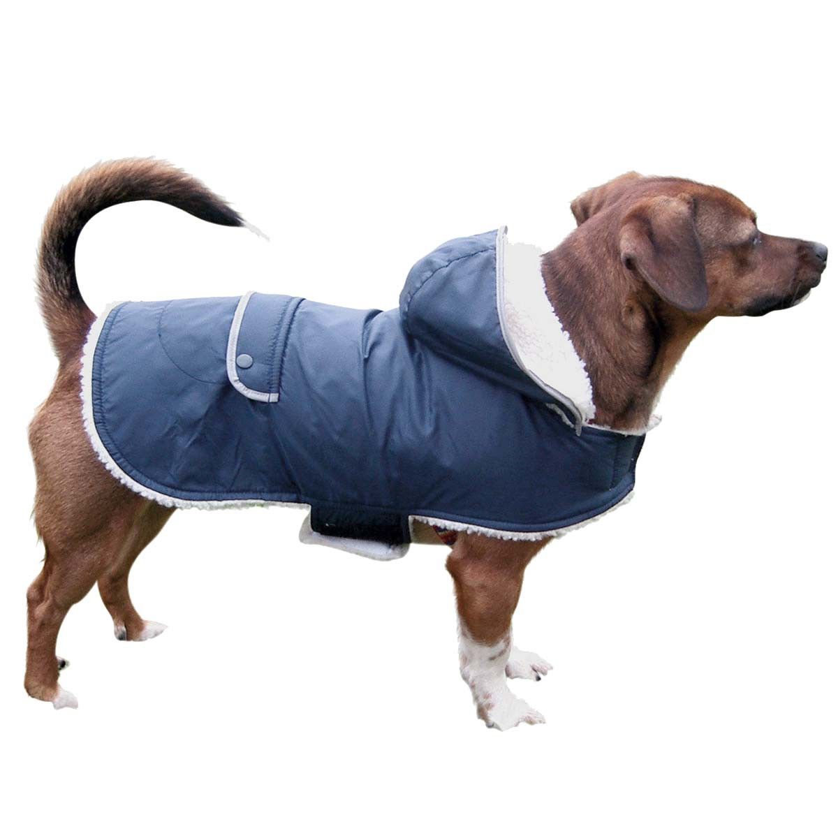 Wenn es draußen ungemütlich ist, dann schützt der Hundemantel Teddy Ihren Vierbeiner. Er ist wasser- und windabweisend und hält durch das Teddyfutter Ihren Liebling schön warm. Der reflektierenden Streifen an der Rückentasche sorgt für optimalen Schutz in der Dunkelheit.