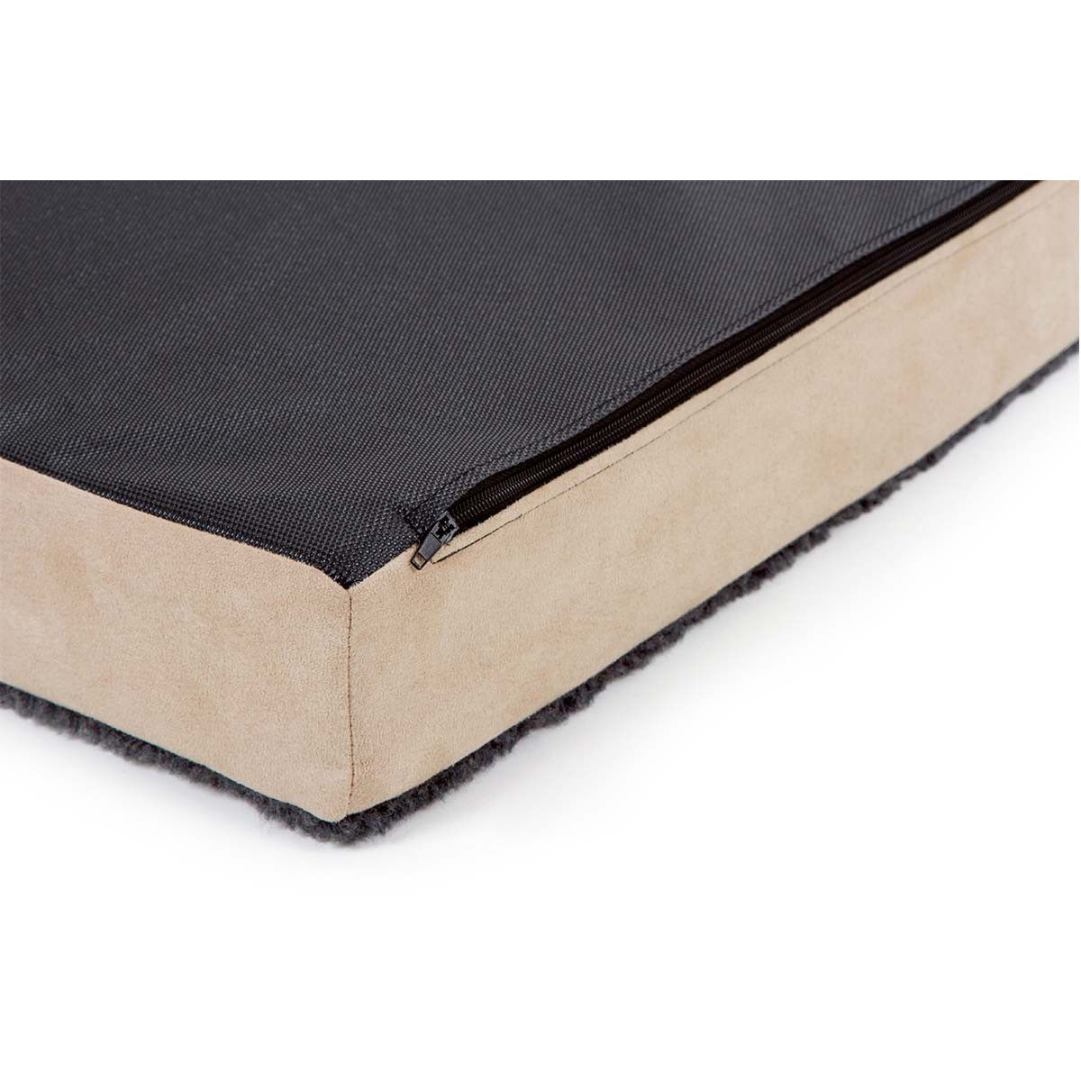 Erholung auf höchstem Niveau bietet diese kuschelige und anpassungsfähige Hundematratze aus thermoelastischem Viscoschaum. Durch die spezielle Eigenschaft des Visco-Schaumstoffs wirkt die Matratze druckentlastend auf die Wirbelsäule und Gelenke. Für zusätzlichen Komfort und erholsamen Schlaf sorgt die Liegefläche aus Schafwoll-Imitat. Die Umrandung besteht aus 83 % Wildleder-Stoff mit 17% Baumwolle, die dem Kissen einen edlen und zeitlosen Look verleiht. Die Gumminoppen an der Unterseite des Kissens verhindern das Wegrutschen auf glatten Oberflächen. Der Bezug der Matratze ist waschbar bei 30°C.