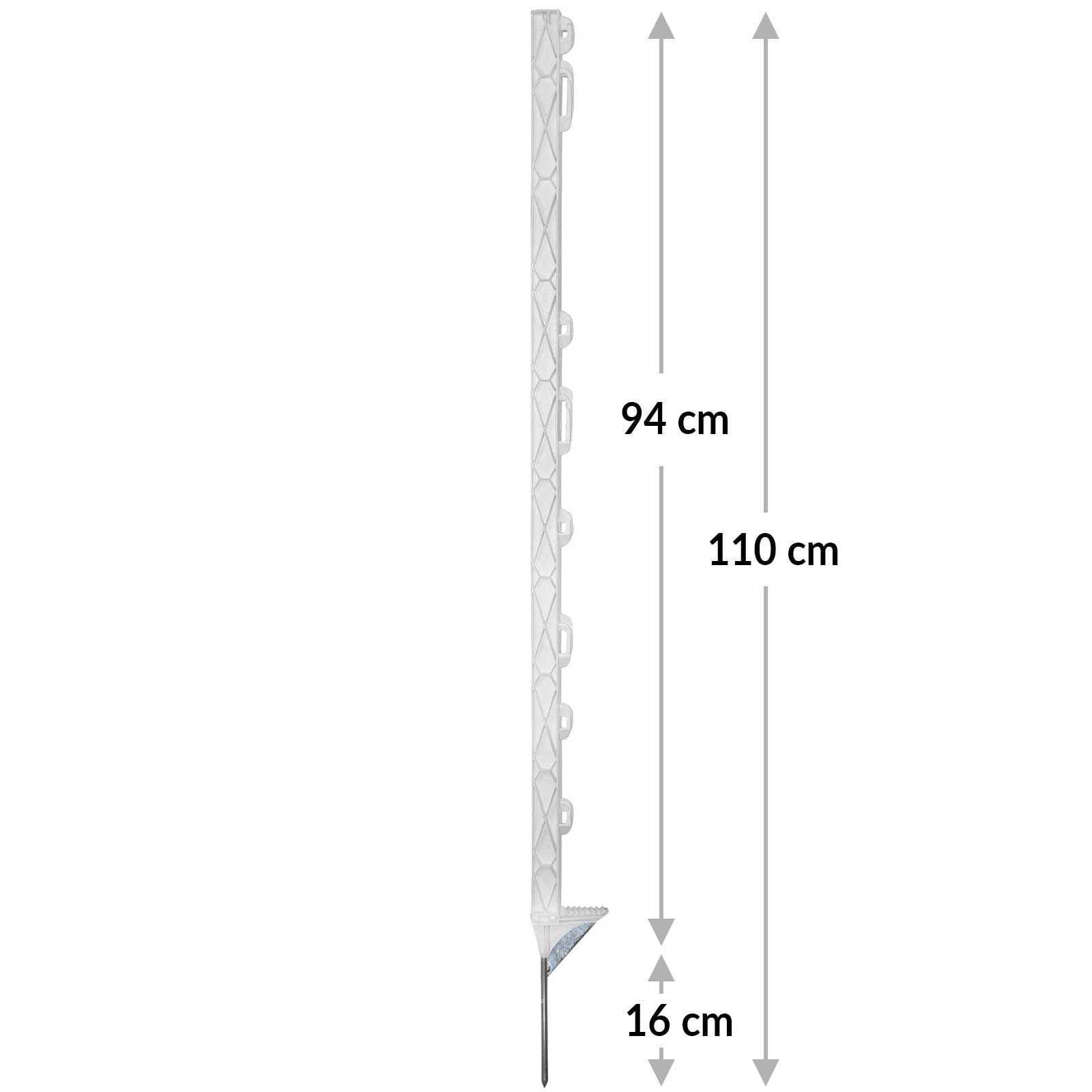 Plasticul de înaltă calitate, extrem de rezistent la impact, face ca stâlpul pentru gardul electric de pășune să fie aproape incasabil și asigură o durată de viață lungă. Susținerea longitudinală suplimentară face ca stâlpul din plastic să fie deosebit de stabil.