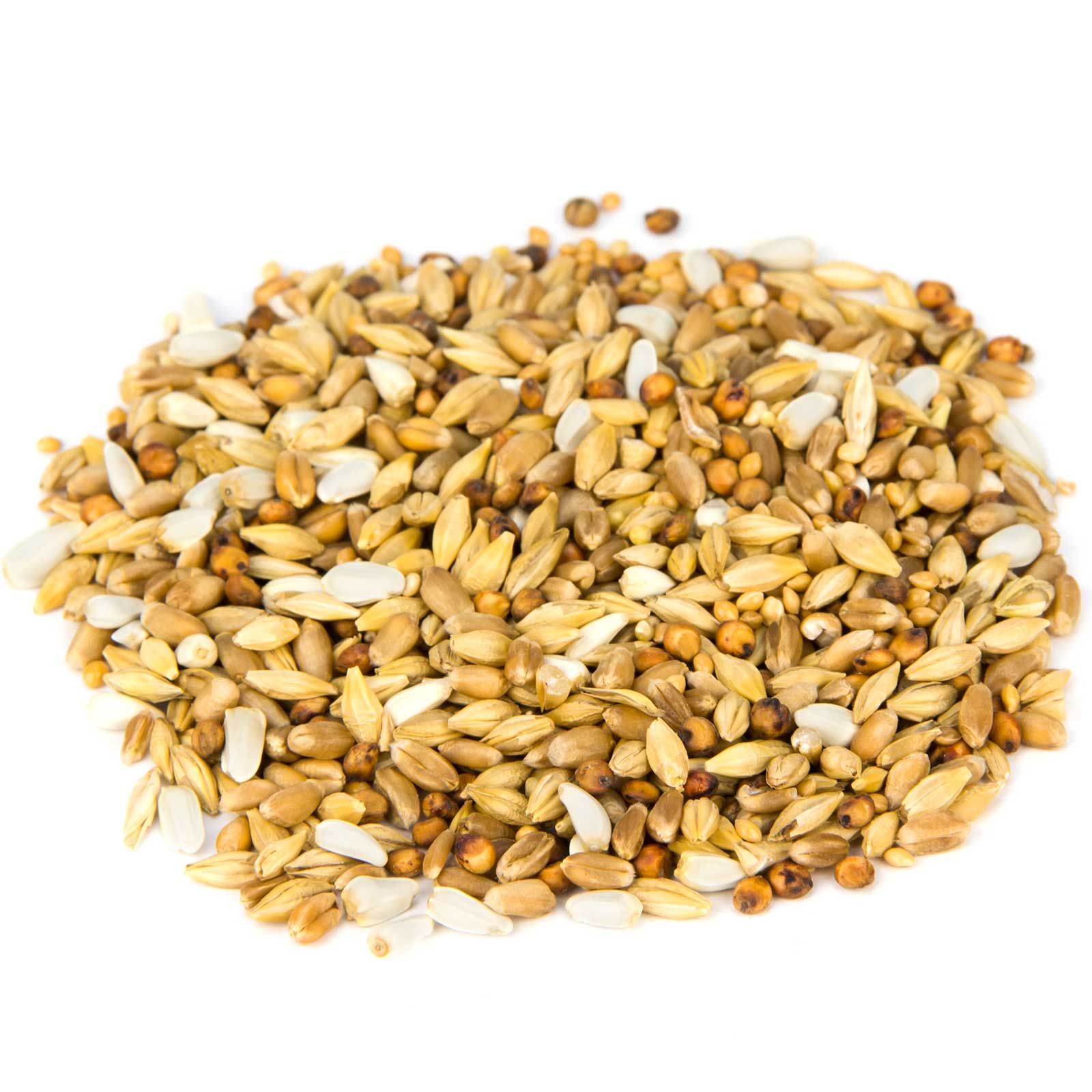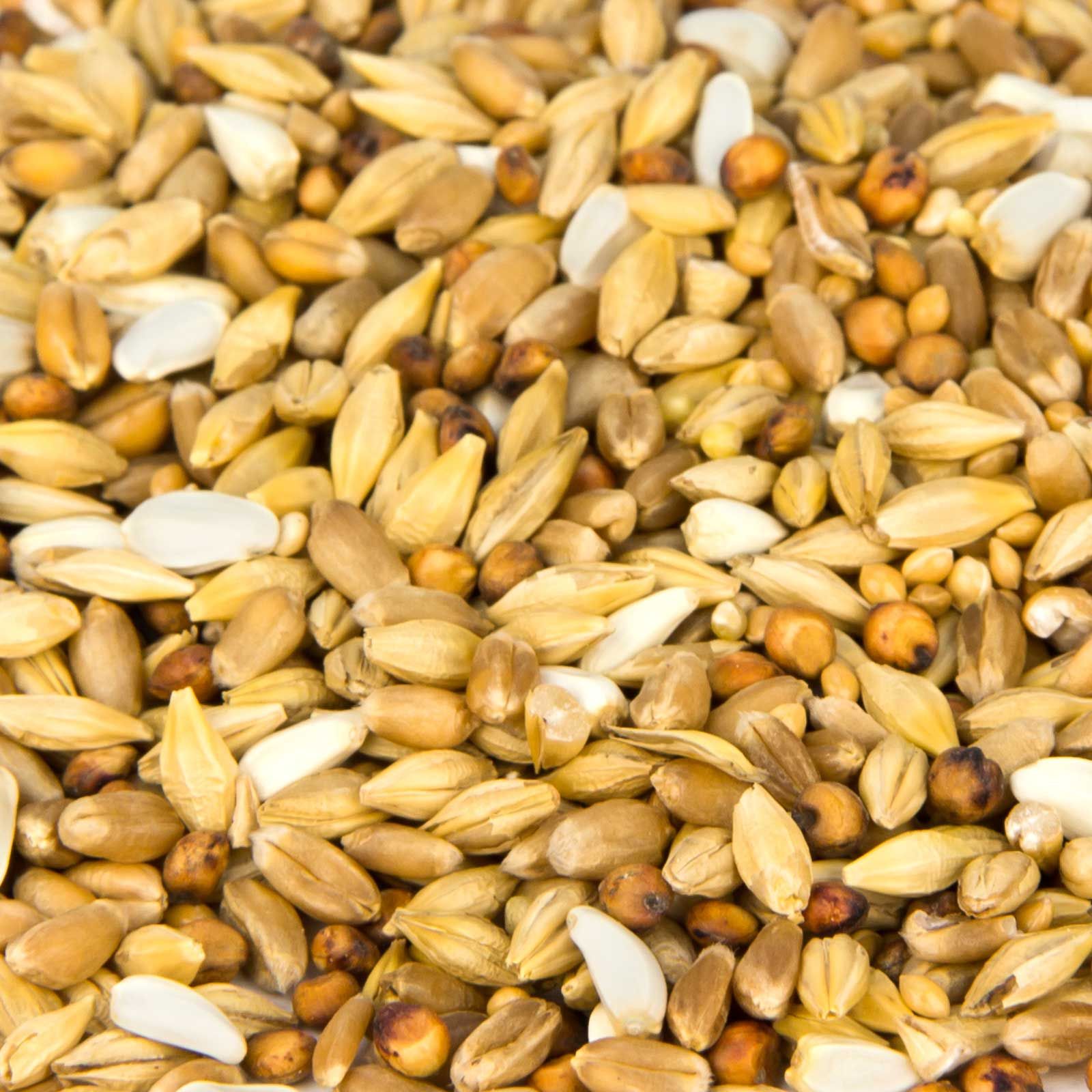 35 % orz pentru bere, 28 % grâu, 15 % dari, 12 % boabe de milo, 8 % mei galben, 2 % semințe de cardi.