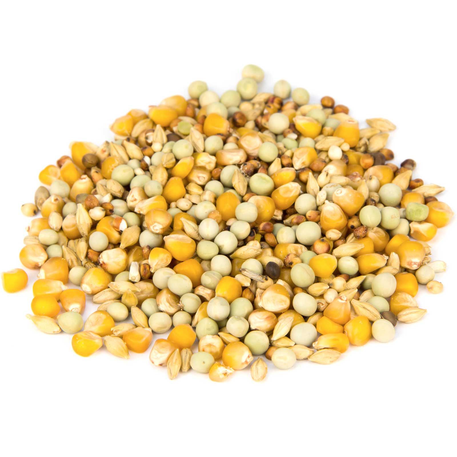42 % porumb mic, 20 % mazăre mică, 17 % orz de bere, 14 % boabe de milo, 4 % dari, 1 % semințe de cardi, 1 % mei, 1 % mei galben.