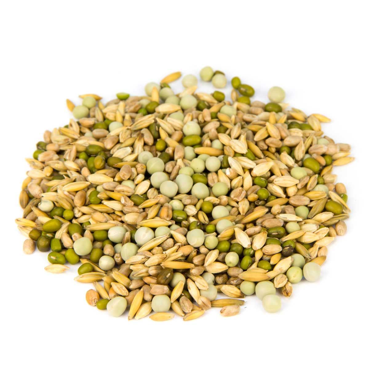 20 % fasole mung, 18 % mazăre mică, 15 % ovăz, 22 % orz pentru bere, 25 % grâu.