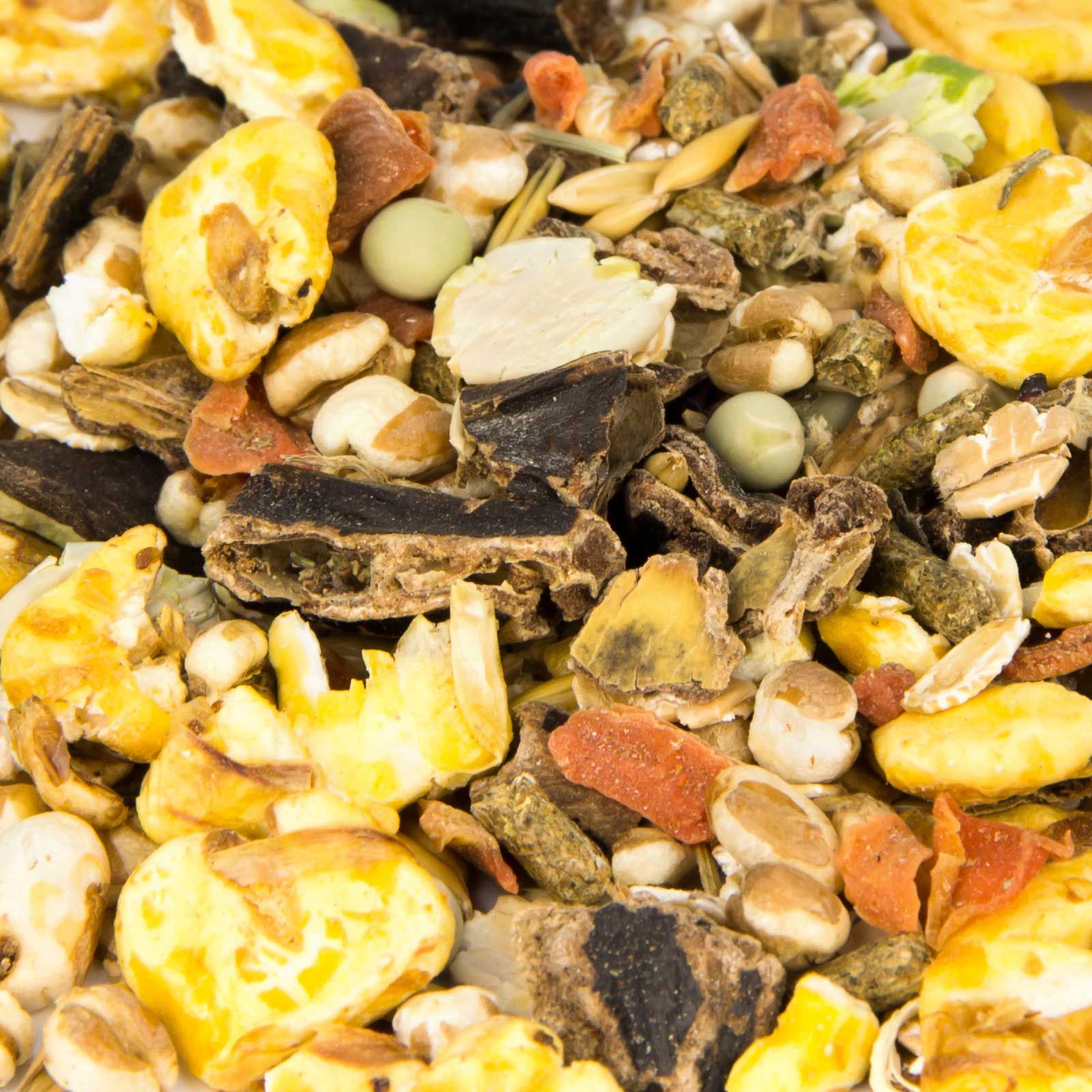 Carbohidrați tăiați felii , porumb încolțit, mazăre verde mică, porumb mic, grâu încolțit, ovăz, morcovi tăiați cubulețe, fulgi de mazăre, fulgi de grâu, fulgi de ovăz, tărâțe grosiere de grâu, făină verde, grâu, concentrat de porumb, tescovină de mere, semințe de anason, pulpă uscată, rădăcină de nalbă, Rădăcină de lemn-dulce, cimbru, frunze de cătină, iarbă de gălbenele, frunze de mure, făină de rapiță cu baton, turtă de semințe de dovleac, hibiscus tăiat, melasă, lignoceluloză, carbonat de calciu, fosfat monocalcic, clorură de sodiu, bicarbonat de sodiu, oxid de magneziu.