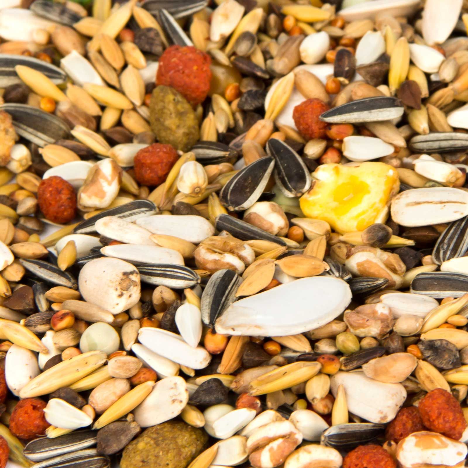 14 % semințe de cardi, 10 % orez nedecorticat, 9 % semințe de floarea-soarelui vărgate, 8 % ovăz, 8 % hrișcă, 6 % semințe albe de floarea-soarelui, 5,44 % grâu, 5 % semințe de milo, 4 % nuci de pin, 3 % cânepă europeană, 3 % semințe de dovleac verde, 3 % grâu încolțit, 3 % porumb mic, 3 % mazăre verde mică, 2,10 % porumb, 2 % mei galben, 2 % mei roșu, 2 % măceșe, 2 % semințe de măceșe, 2 % semințe de ciulin de lapte, 1 % semințe lucioase, 1 % porumb încolțit, 1 % pepperoni, 0,60 % arahide decojite, 0,60 % făină de extracție de soia (fasole) cu săpun (încălzită cu abur), 0,49 % crupe de grâu, 0,30 % cuburi de mere, 0,12 % zahăr din sfeclă, 0,12 % carbonat de calciu, 0,12 % ulei de floarea-soarelui, 0,06 % fosfat monosodic, 0,03 % DL-metionină, 0,02 % clorură de sodiu.