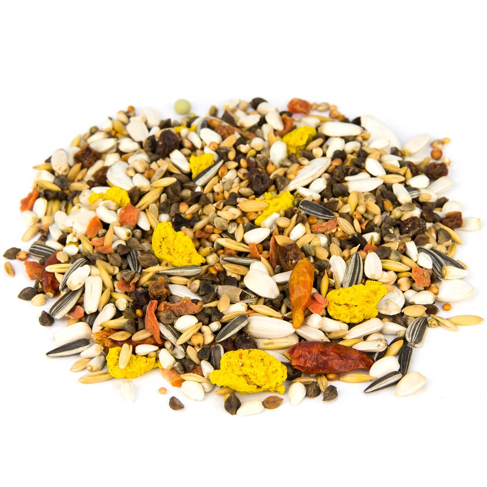 17 % semințe de cardi, 10 % orez nedecorticat, 16 % hrișcă, 7 % boabe de milo, 6 % ovăz, 6 % hrișcă decorticată, 5 % fulgi de ovăz, 4 % cânepă, 3 % mei roșu, 3 % floarea-soarelui vărgat, 3 % dari, 3 % mei galben, 4 % floarea-soarelui albă, 3 % fulgi de morcov, 2 % sultane, 2 % orez furajer, 2 % semințe de dovleac alb, 1 % roibă, 0,7 % ardei gras, 0,3 % mazăre mică, 2 % crochete de porumb galben