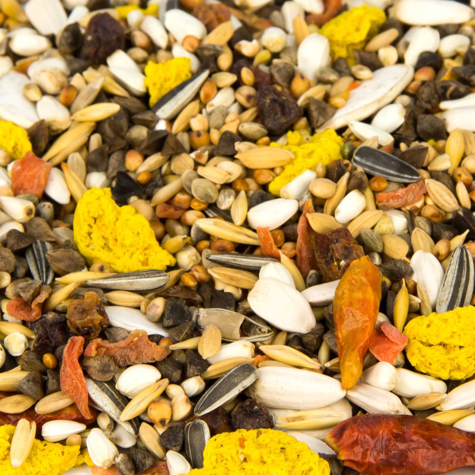 17 % semințe de cardi, 10 % orez nedecorticat, 16 % hrișcă, 7 % boabe de milo, 6 % ovăz, 6 % hrișcă decorticată, 5 % fulgi de ovăz, 4 % cânepă, 3 % mei roșu, 3 % floarea-soarelui vărgat, 3 % dari, 3 % mei galben, 4 % floarea-soarelui albă, 3 % fulgi de morcov, 2 % sultane, 2 % orez furajer, 2 % semințe de dovleac alb, 1 % roibă, 0,7 % ardei gras, 0,3 % mazăre mică, 2 % crochete de porumb galben