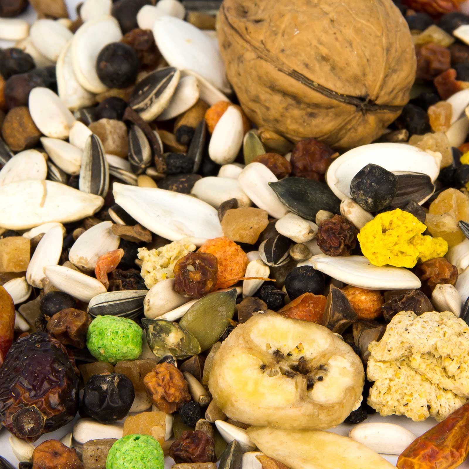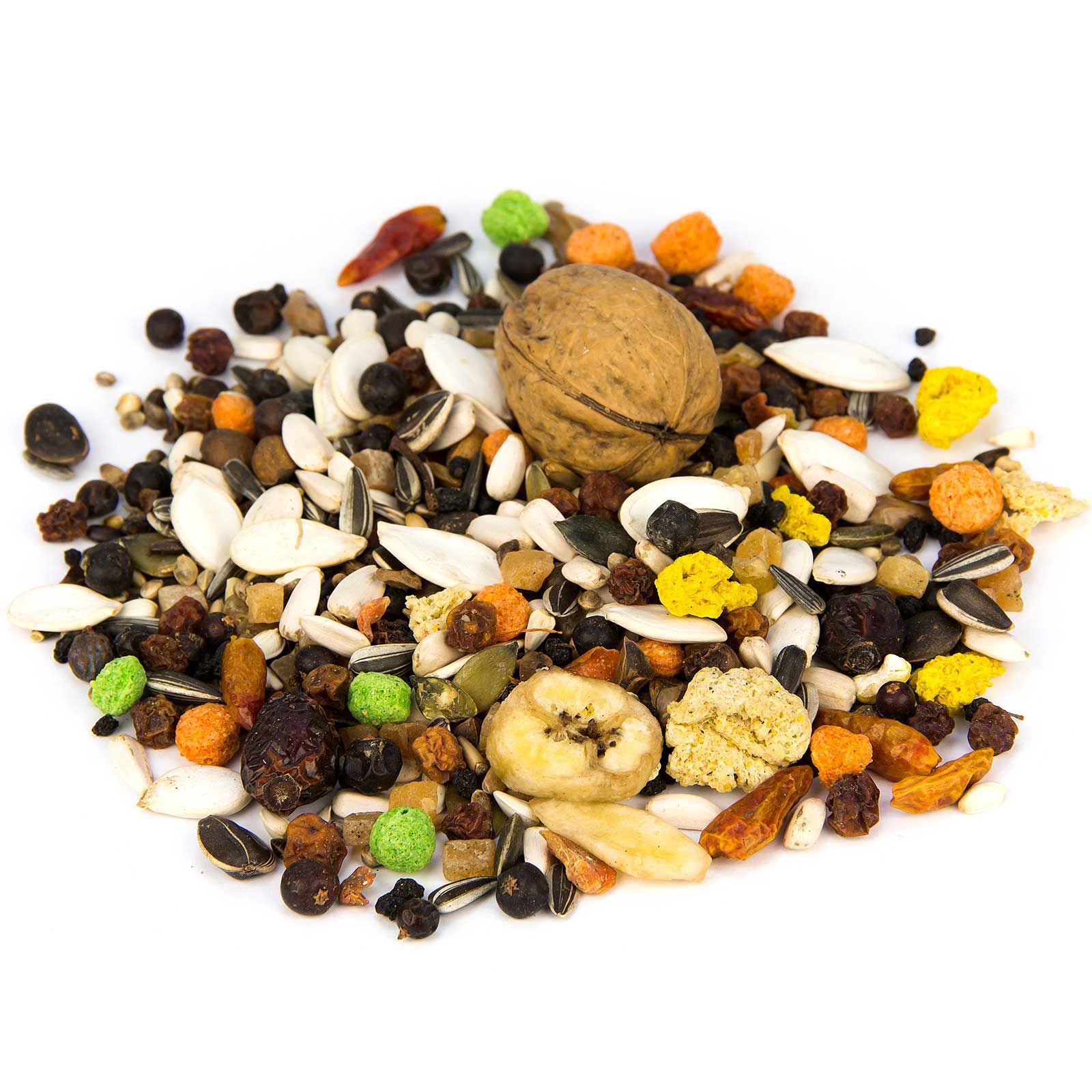 8 % Tutti Frutti, 13 % floarea-soarelui dungată, 12 % floarea-soarelui albă, 7 % cânepă, 5 % fructe de ienupăr, 5 % fructe de sorb, 5 % fructe de soc, 3 % crochete de porumb roșii, 4 % nuci de pin medii, 5 % ciulin de lapte, 2 % crochete de porumb verzi, 5 % semințe de dovleac albe, 3 % semințe de dovleac verzi, 3 % nuci, 3 % măceșe, 3 % chipsuri de banane, 2 % pepperoni, 3 % piele roșie, 2 % fulgi de ovăz, 2 % Dari, 3 % hrișcă, 1 % felii de morcovi, 2 % crochete de porumb galbene