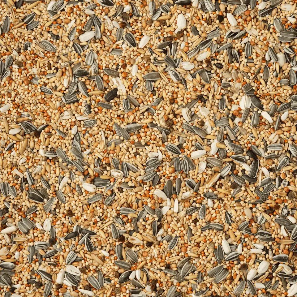 37 % mei galben, 8 % mei roșu, 5 % semințe lucioase, 8 % fulgi de ovăz, 9 % grâu, 4 % hrișcă, 6 % boabe de milo, 2 % cânepă, 2 % semințe de cardi, 13 % floarea-soarelui vărgată, 3 % floarea-soarelui albă, 3 % ovăz.