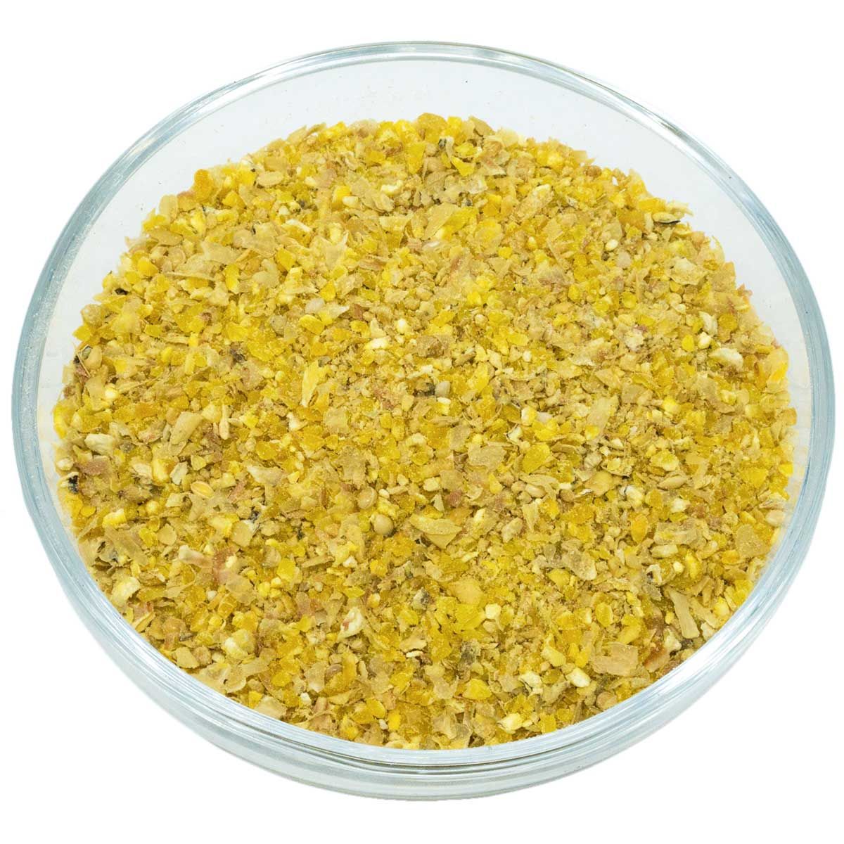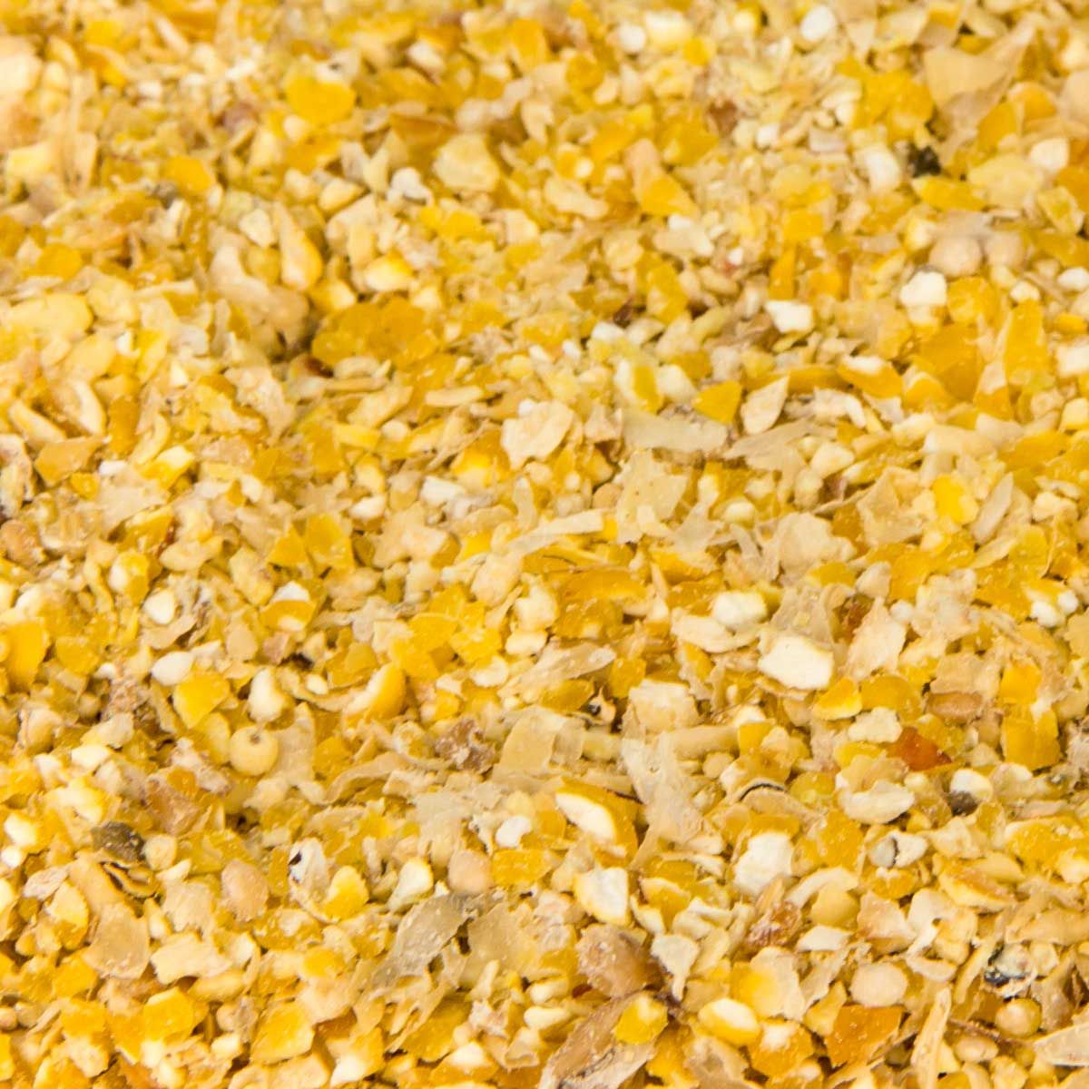 Compoziție: griș de porumb, făină de extracție de soia (fasole) cu săpun (încălzită cu abur), carbonat de calciu, mei galben, griș de midii, ulei de floarea-soarelui, fosfat monocalcic, clorură de sodiu, bicarbonat de sodiu, oxid de magneziu.